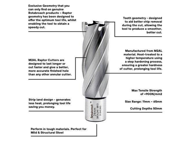 The Rotabroach rail cutter system delivers high-performance annular cutting capability for materials up to 1100 N/mm² tensile strength. With optimized flutes for chip evacuation and hardened construction for flexibility during operation, the kit ensures reduced tool wear, smooth cutting action, and dependable results in industrial rail maintenance and heavy-duty drilling tasks.