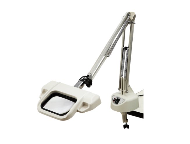 Otsuka Optics’ OLIGHT3L-F 6500K features a rectangular lens with minimized distortion and a slanted LED light panel to reveal surface scratches and contours. The free arm and clamp design allow workspace flexibility, while optional AR-coated lenses reduce reflection and improve clarity during prolonged inspection use.