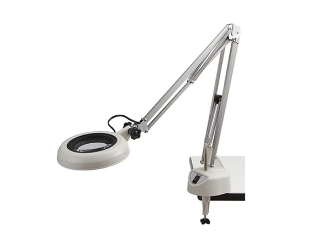 Designed for professionals, the SKKL-F features a slim LED head with a diffuser to reduce glare and protect work surfaces. Interchangeable magnification lenses from 2× to 15× enhance visual inspection accuracy while the horizontally swiveling arm and compact clamp improve workspace efficiency. A simple head-mounted ON/OFF switch offers convenience.