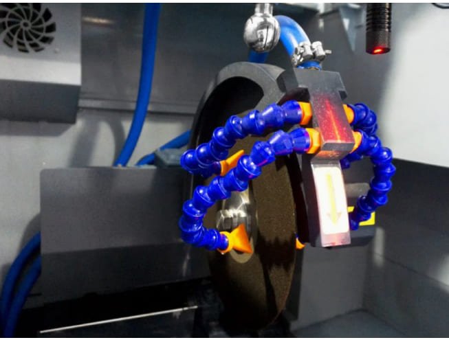 The Beta-400MA offers flexible operation with joystick control over the blade and table, 3-axis movement (X, Y, Z), and programmable feed speeds. It delivers a blade speed range of 800-2000 rpm using Ø400-450 mm blades with a Ø32 mm arbor. Cooling is handled by a 130-L recirculating tank and 6-channel, high flow hoses to prevent overheating. Safety features include two-hand operation, door interlocks, emergency stop, and limit switches.